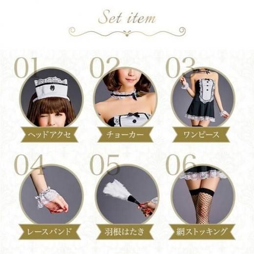 1:ヘッドアクセ 2:チョーカー 3:ワンピース 4:レースバンド2点 5:羽根はたき 6:網ストッキング